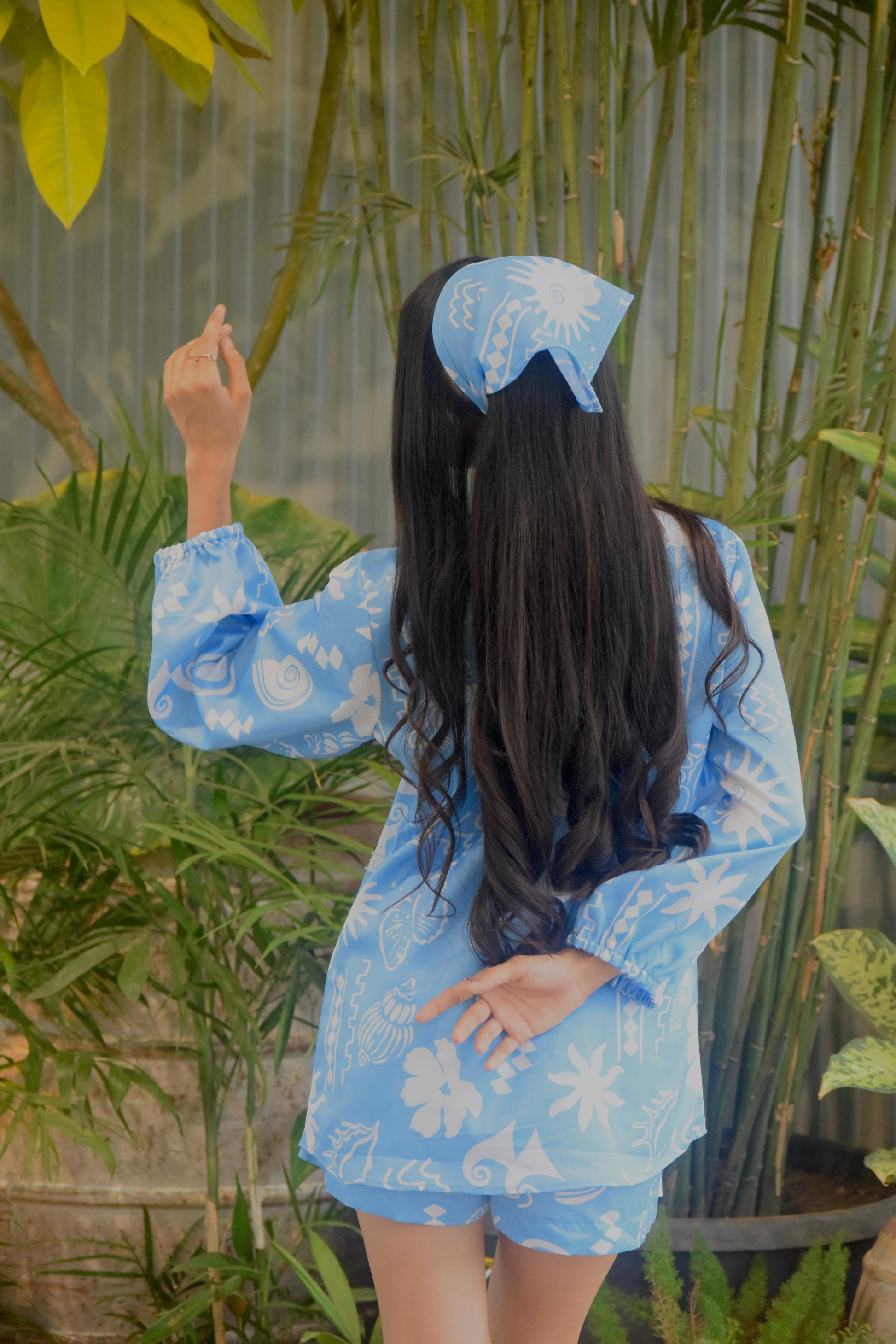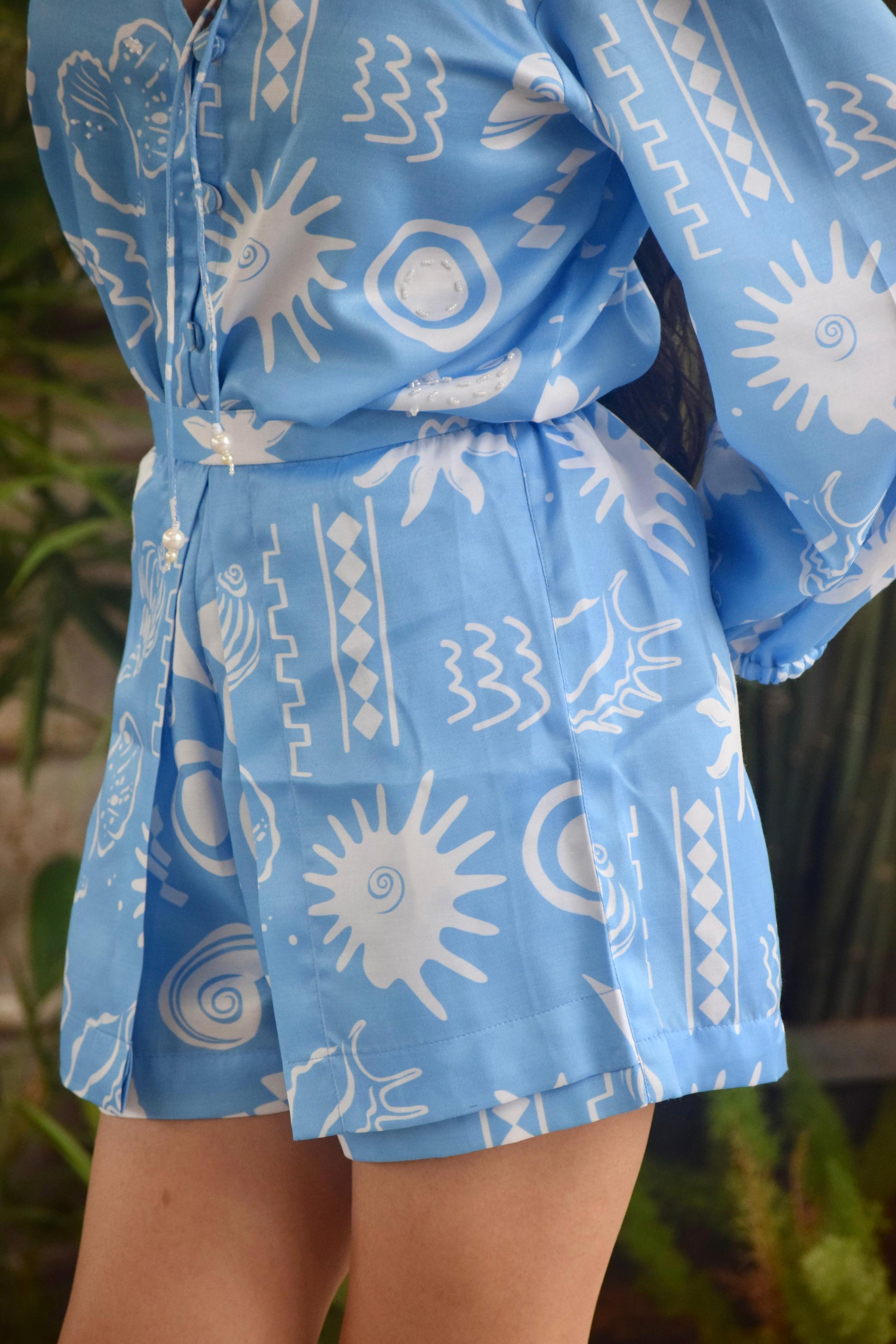 Inspired by serene coastal mornings and summer light, this soft blue and white Skorts features our exclusive abstract print — shimmering shells, gentle waves, and warm sunshine come to life in a breezy silhouette, complete with hand embroidery for artisanal charm.