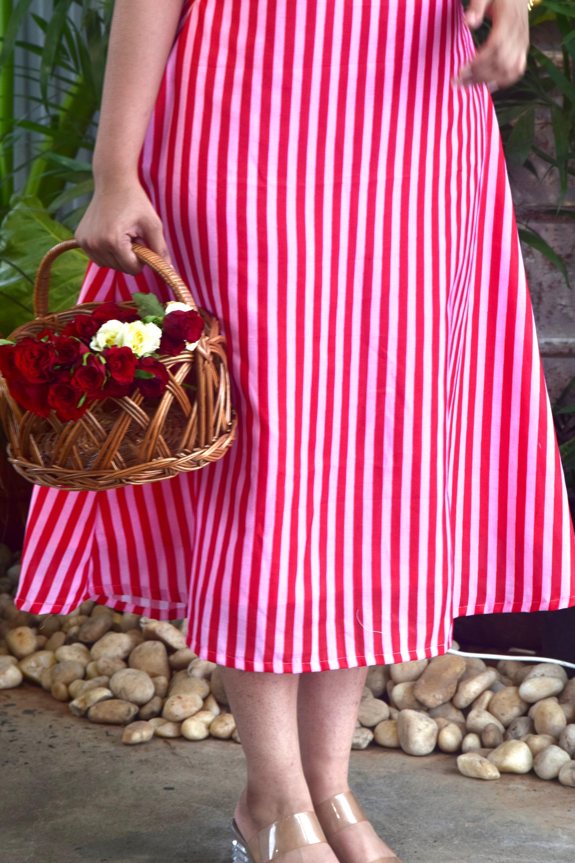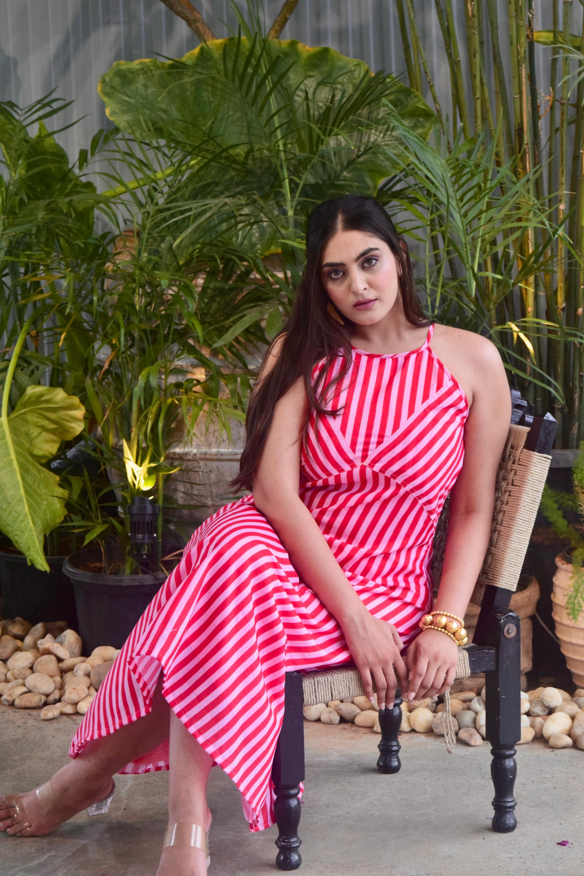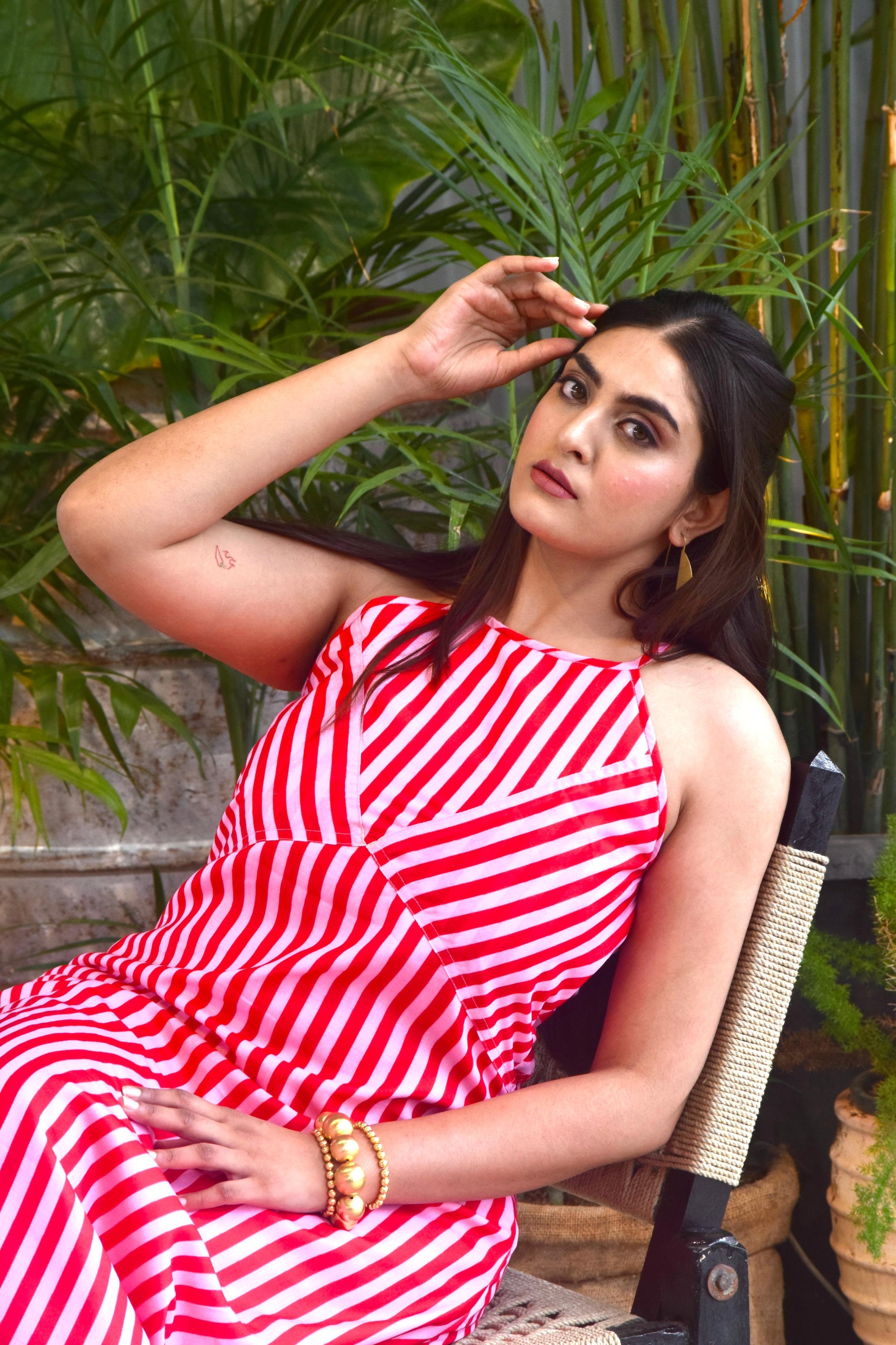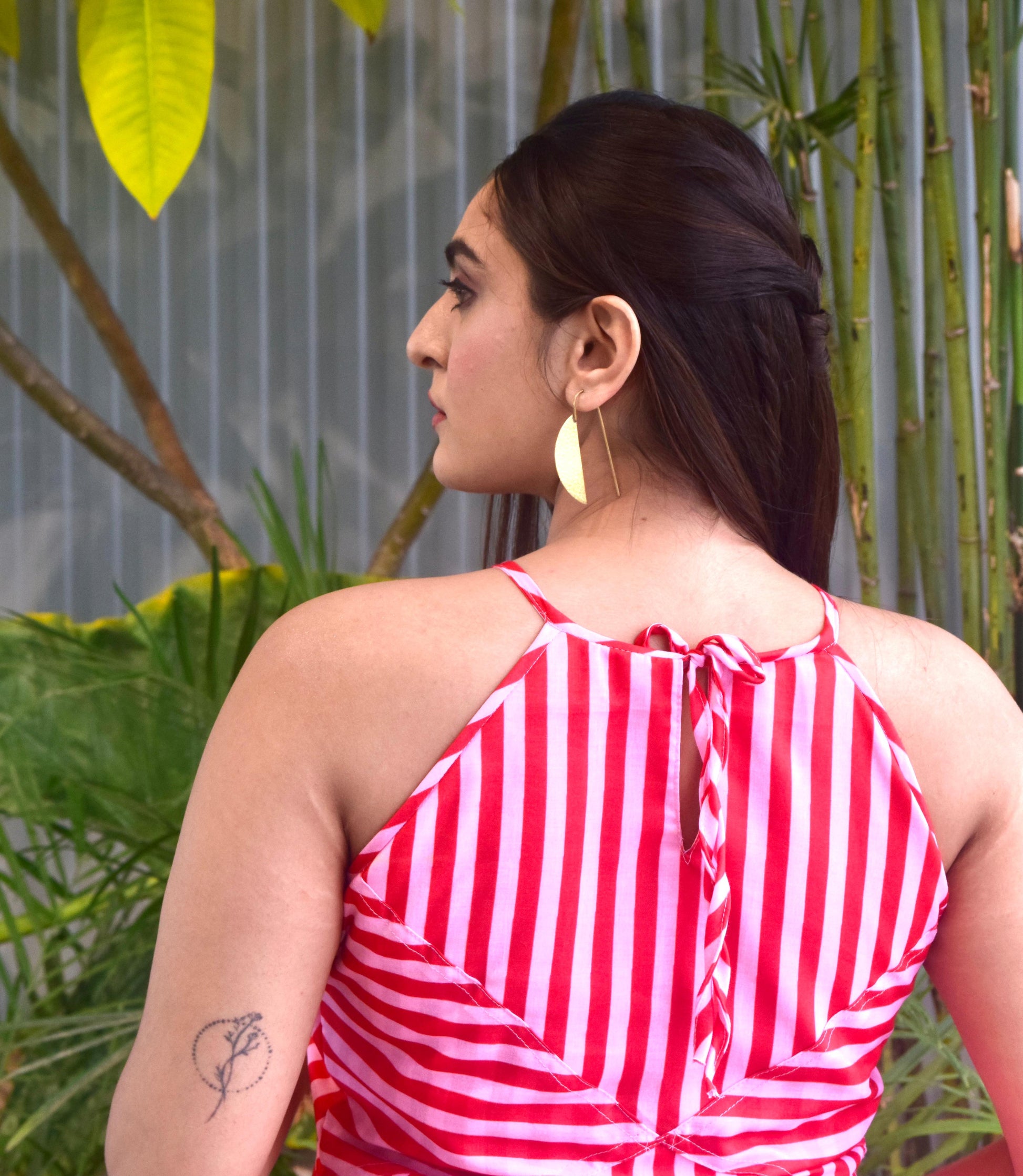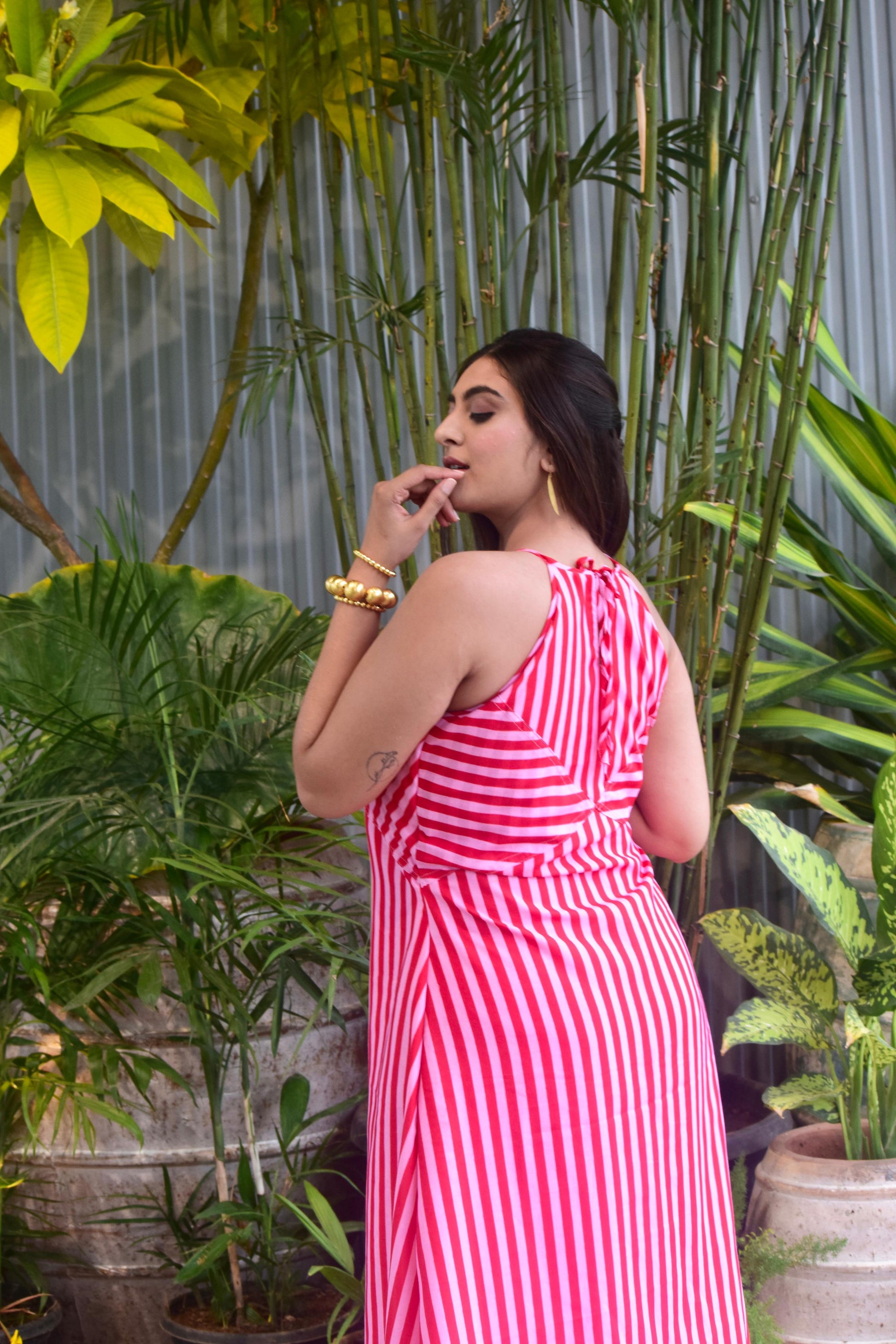 A bold beauty made for slow sunsets and golden hour escapes. Crafted in our signature red-pink vertical stripe print, this halter midi dress brings together effortless movement with sculpted detail — an elevated essential for daytime glam or dinner under the stars.