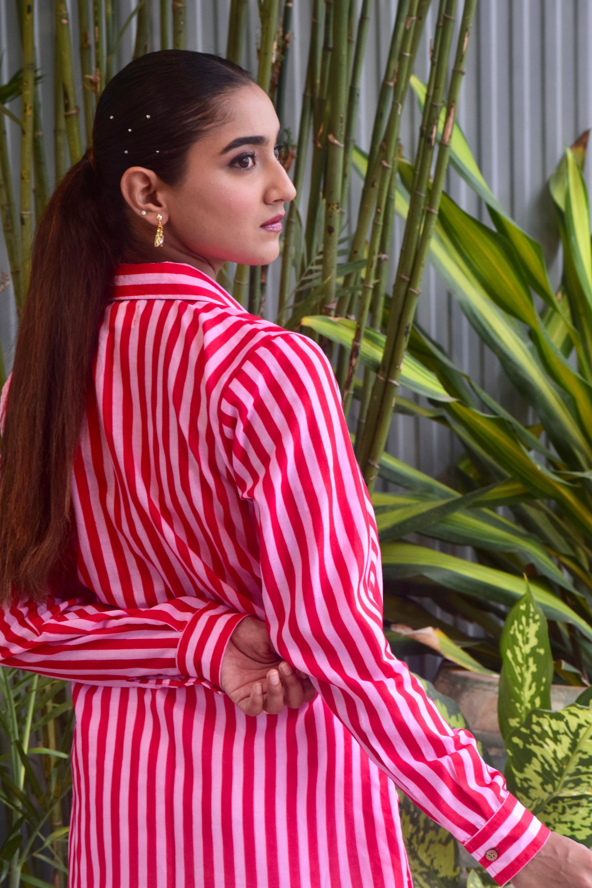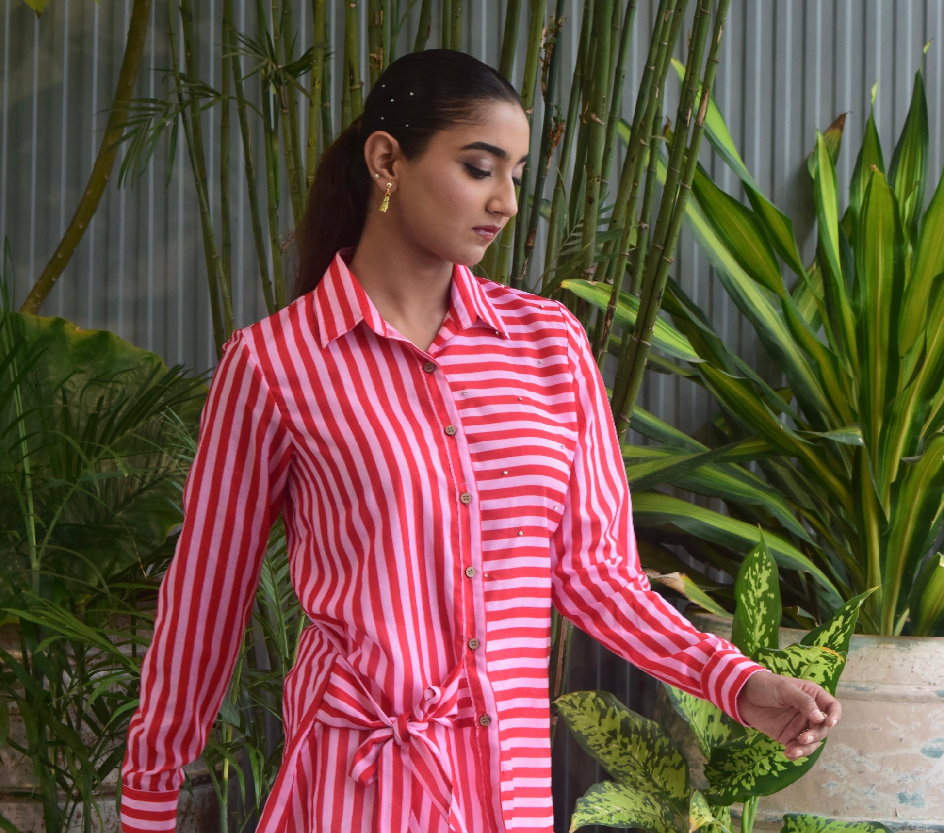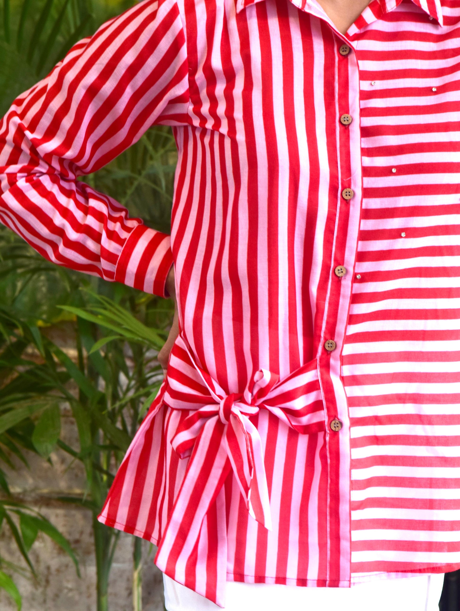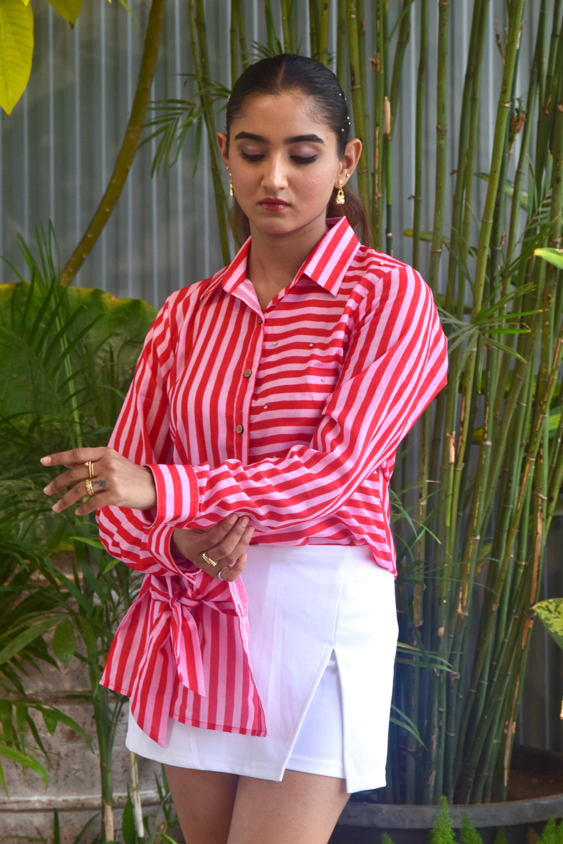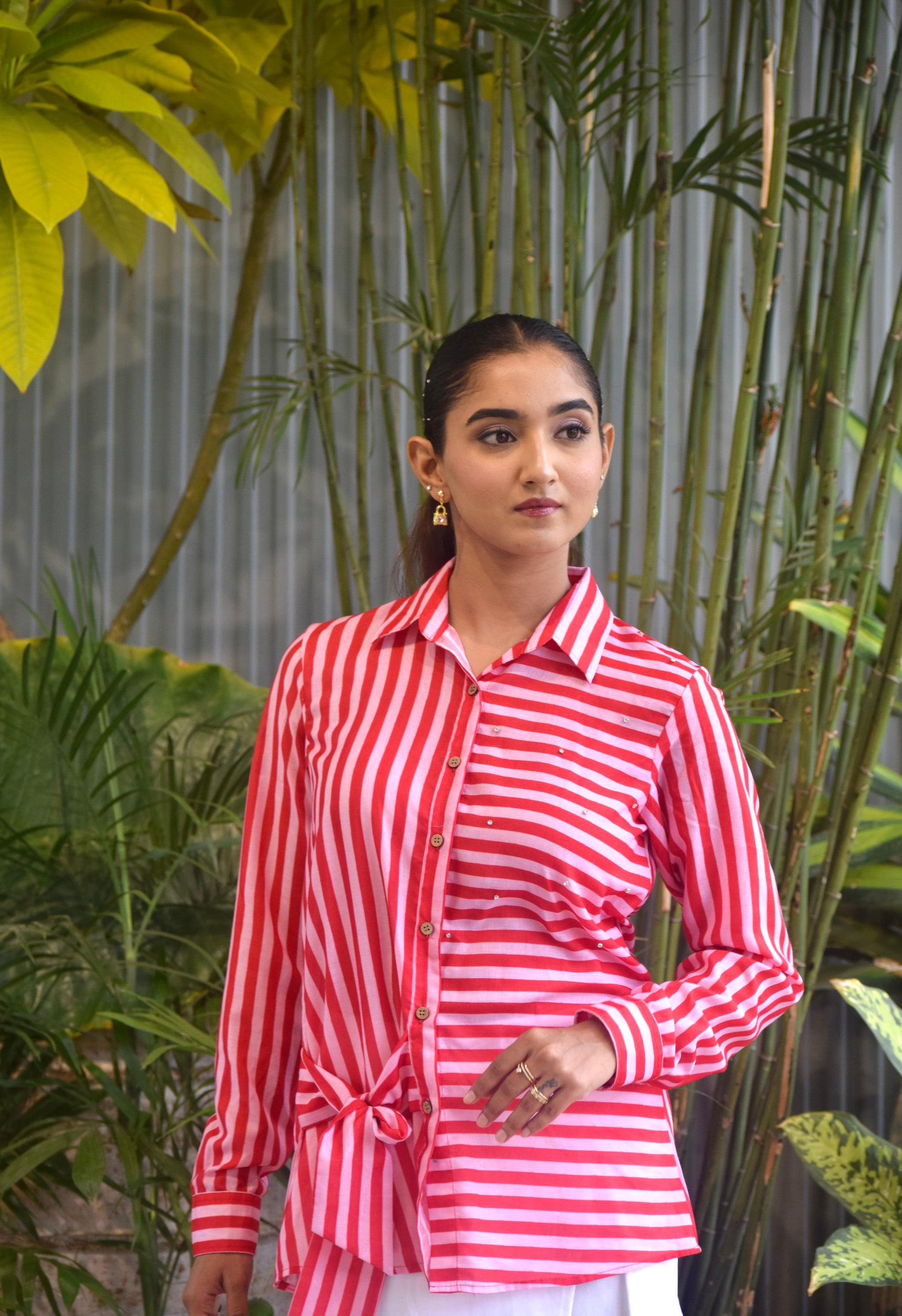 Classic meets playful in this twist-on-a-shirt essential. Crafted in breathable cotton with bold red-pink hand-drawn stripes, it features contrasting panels, rhinestone accents, and a statement bow detail — offering effortless polish with personality, perfect for day-to-night dressing.