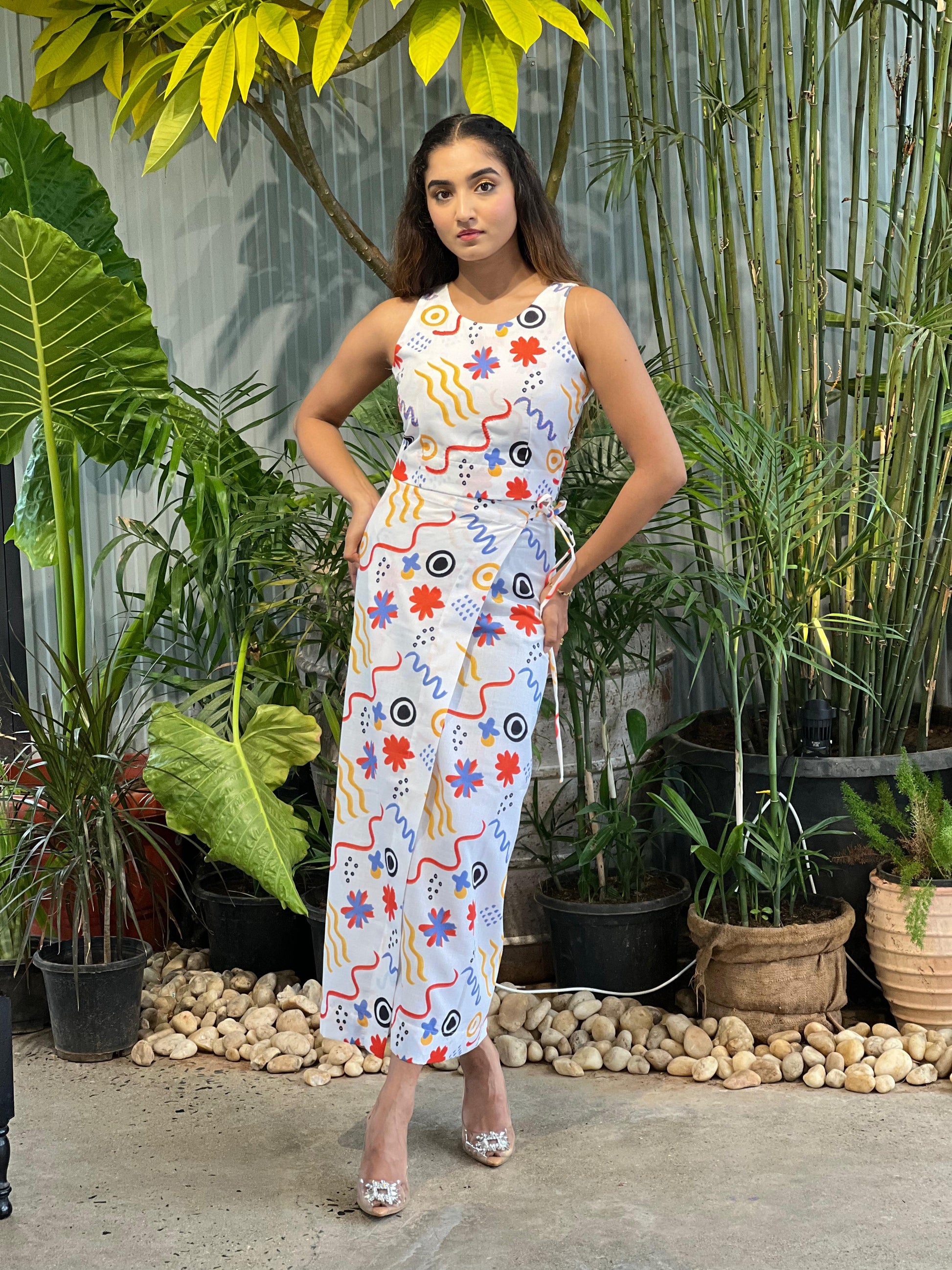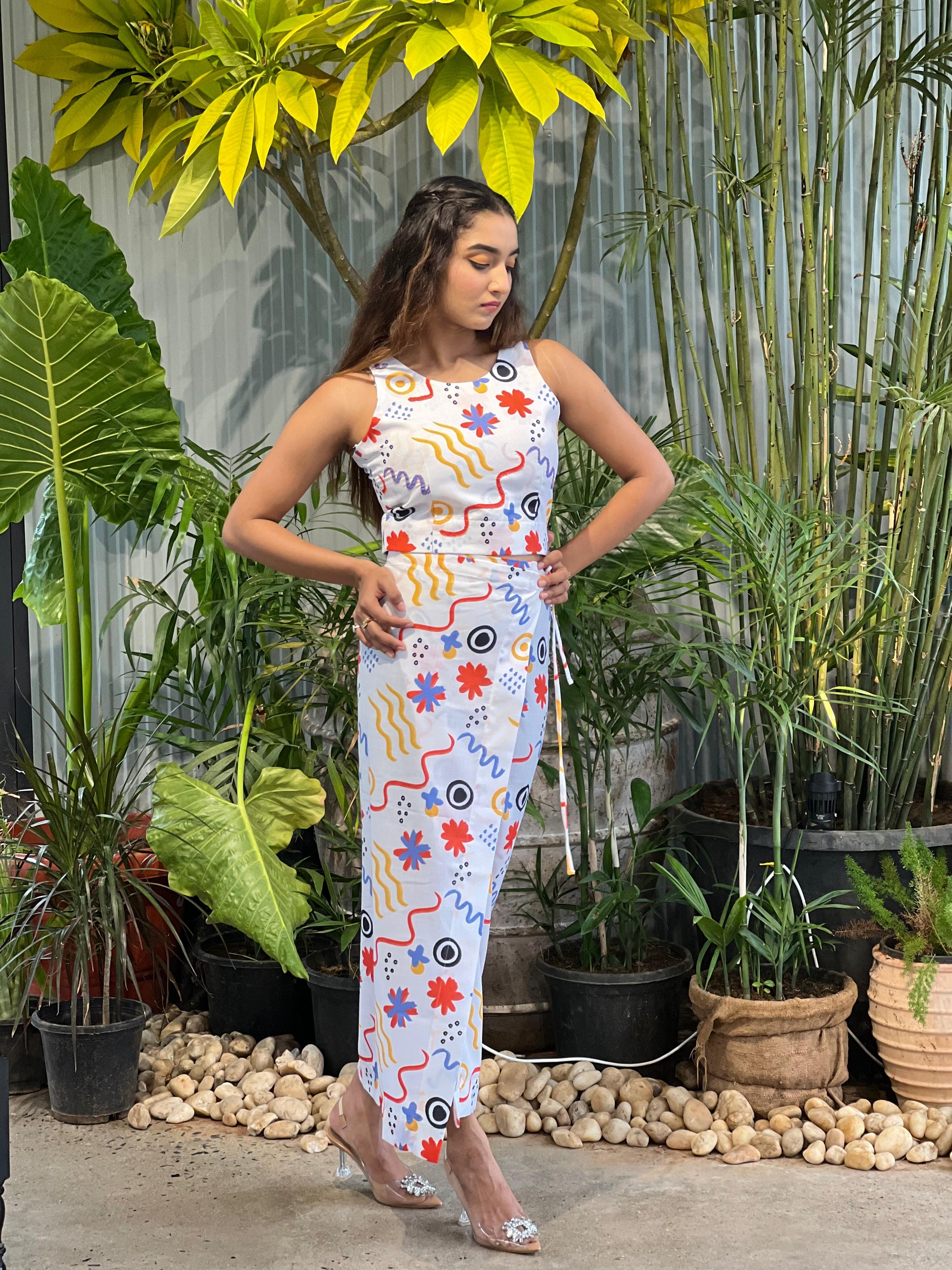 Freestyle Wrap Skirt & Button-Back crop top– Multicolour on White