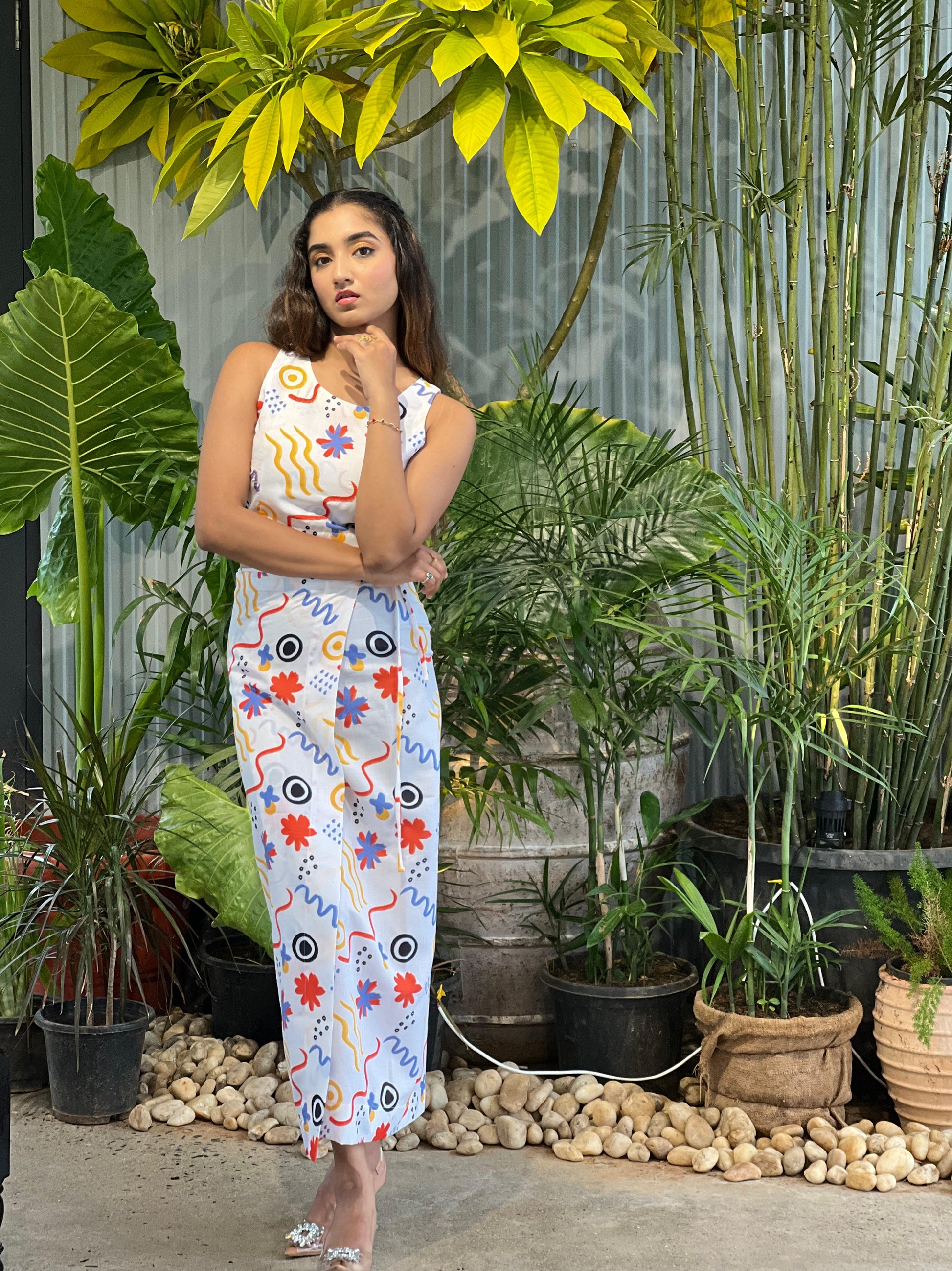 This head-turning co-ord set captures the spirit of effortless elegance with a touch of vintage romance. Crafted in our signature abstract print, it blends dreamy design with modern silhouettes—perfect for beachside dinners, art showings, or sunset soirées.