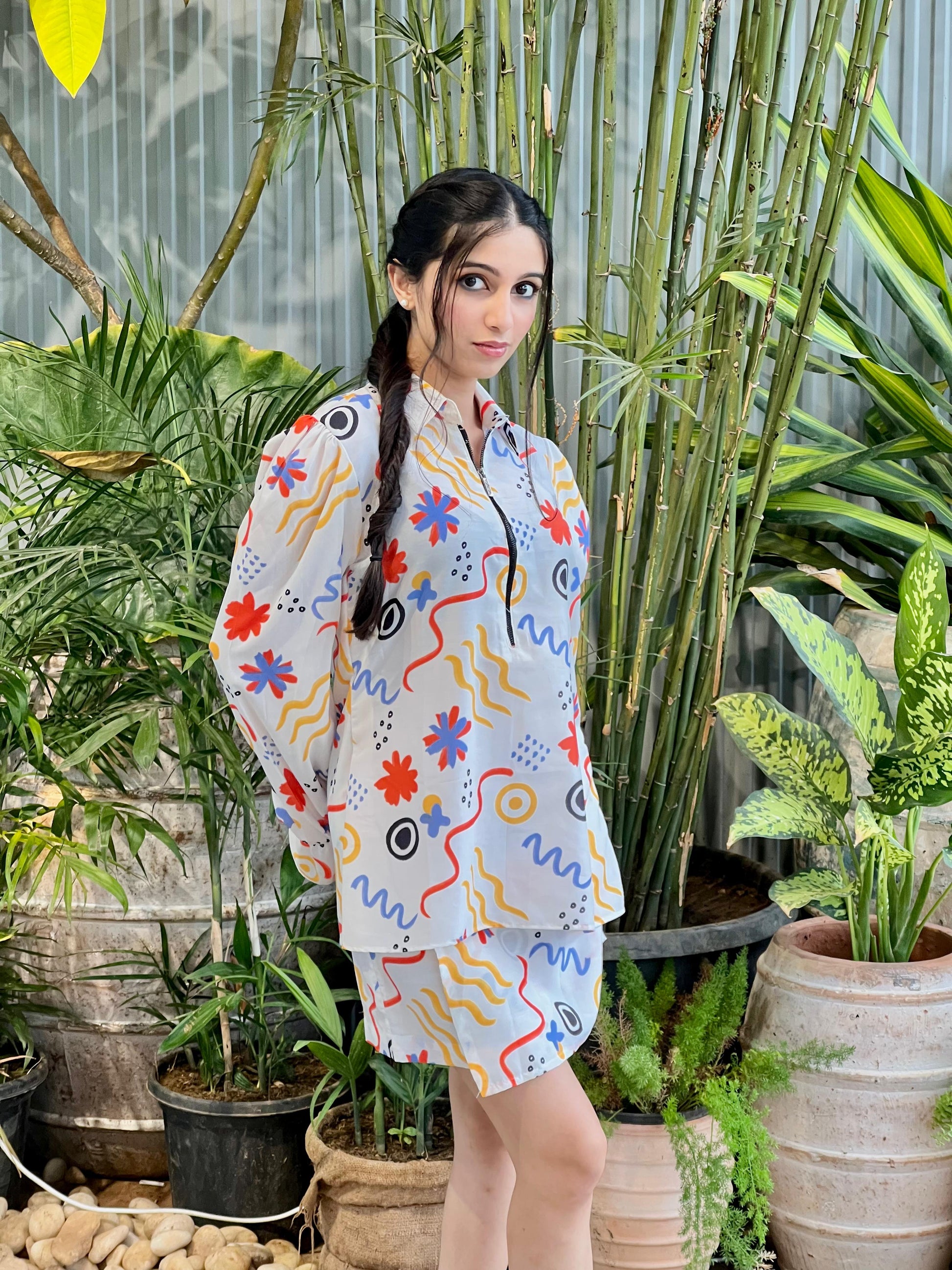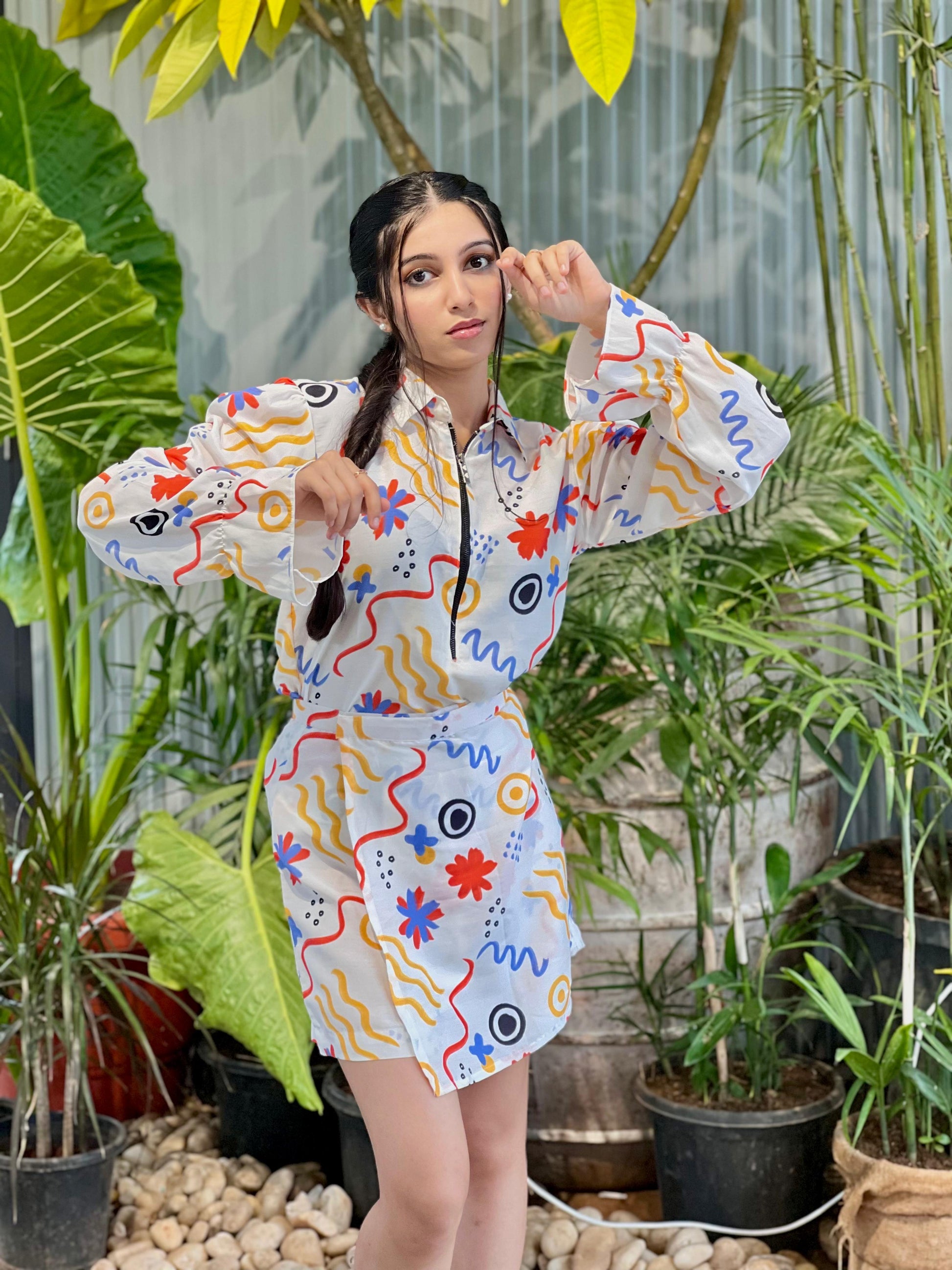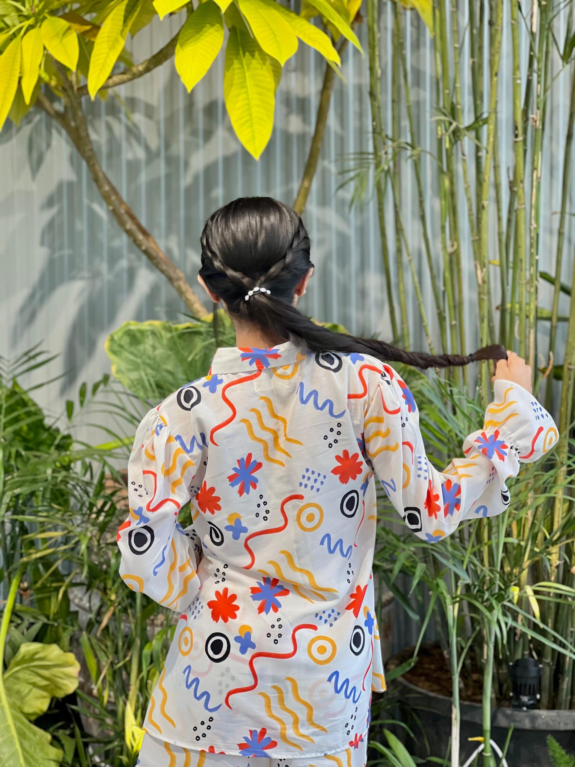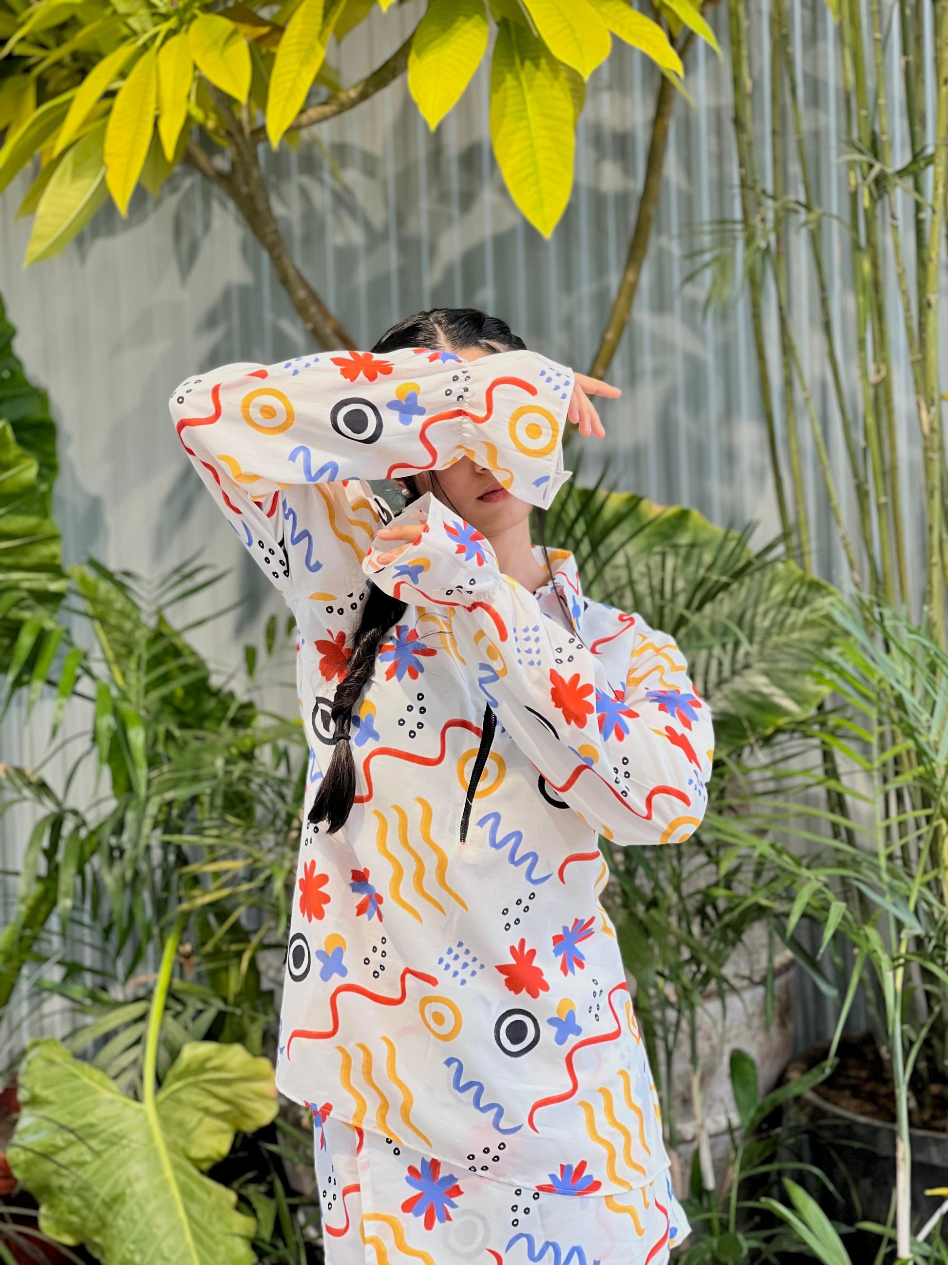Turn heads in this vibrant Shirt, drenched in retro-inspired charm. With its bold, hand-drawn print and breezy silhouette, this look is made for gallery strolls, travel days, or brunching under the sun. Designed in airy muslin cotton, it's a striking blend of color, comfort, and ease.