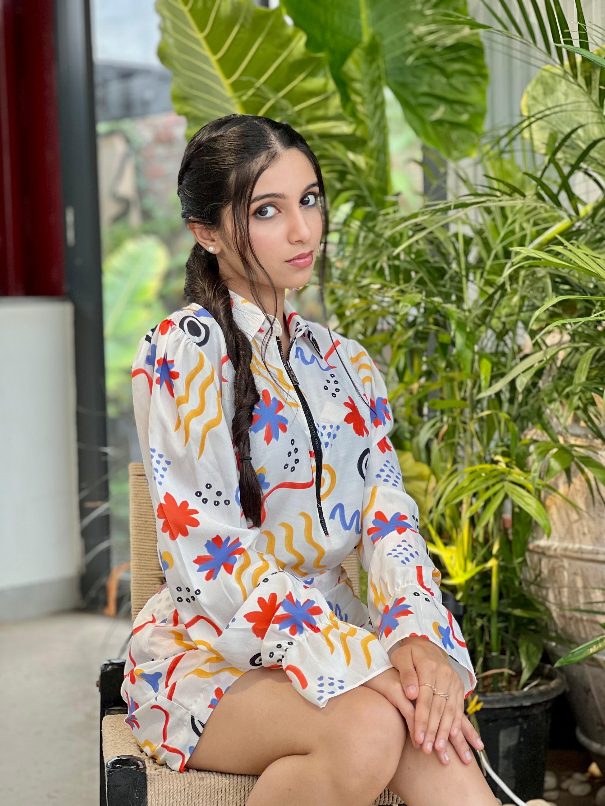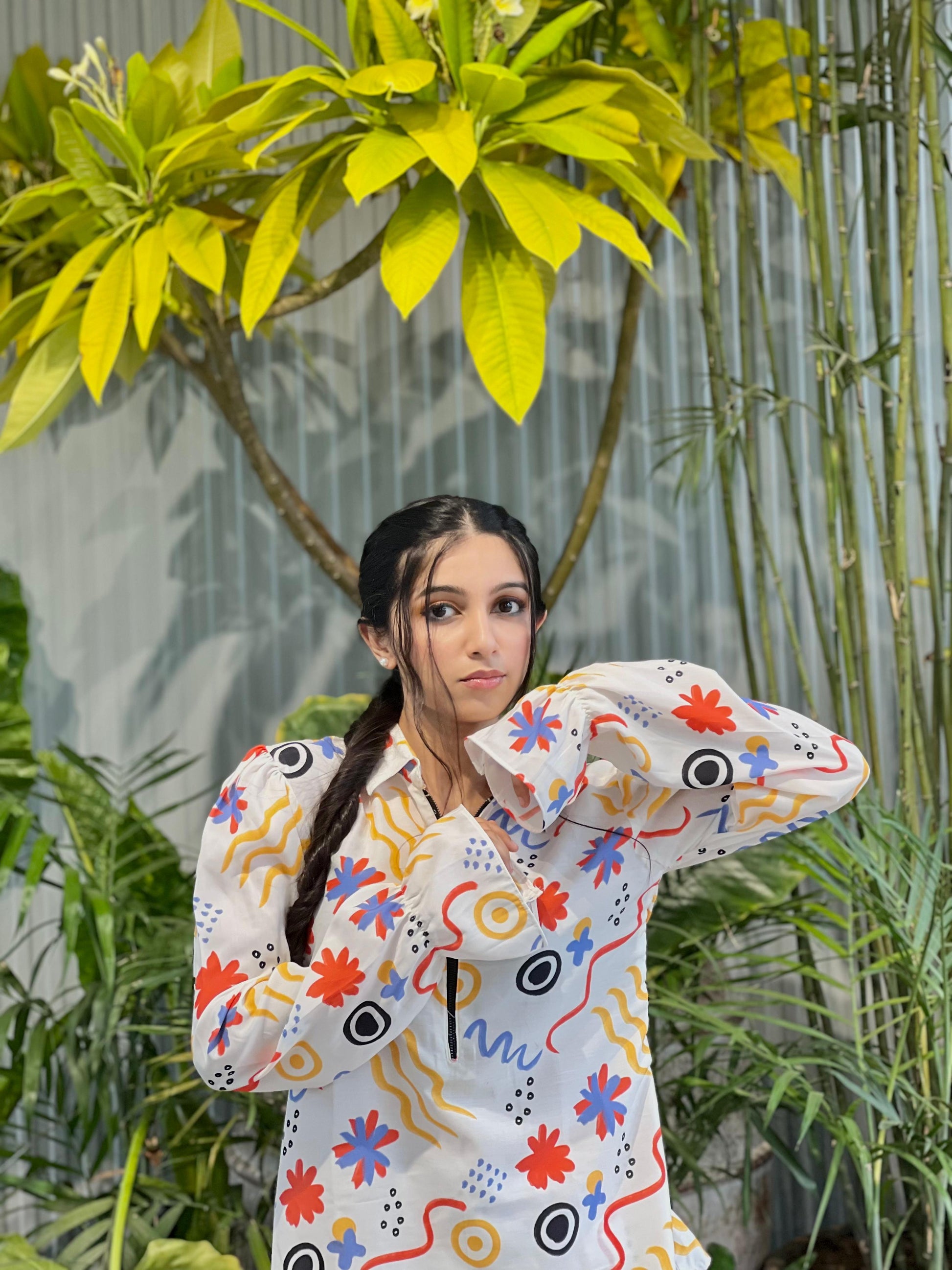 - Self-designed abstract print featuring florals, squiggles, dots, and retro circles in red, mustard, cobalt, and black on a crisp white base